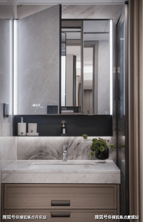 背后主墙面采用岩板设计,经久耐用,内部还收纳细节还预留4孔电源,电动牙刷、卷发棒等吹风机收纳孔、洗脸巾抽取孔.