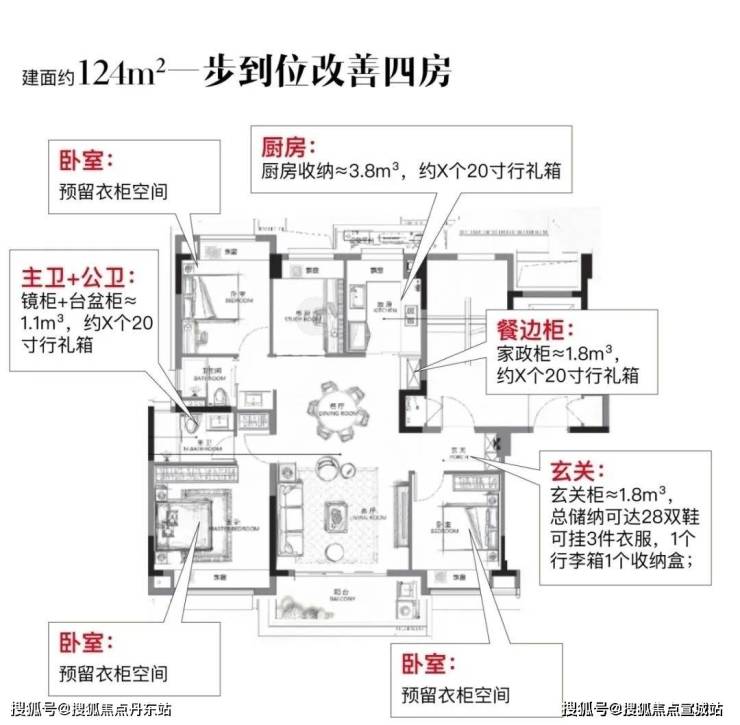这就是洋房+飞机户型带来的超高得房率优势.并且,这个户型同样拥有约6.7㎡飘窗面积+约3.9㎡阳台面积赠送,赠送率达8.5%,厨房飘窗约1.1㎡超大台面,赠送同总价、同户型第一!还有大量的收纳空间: