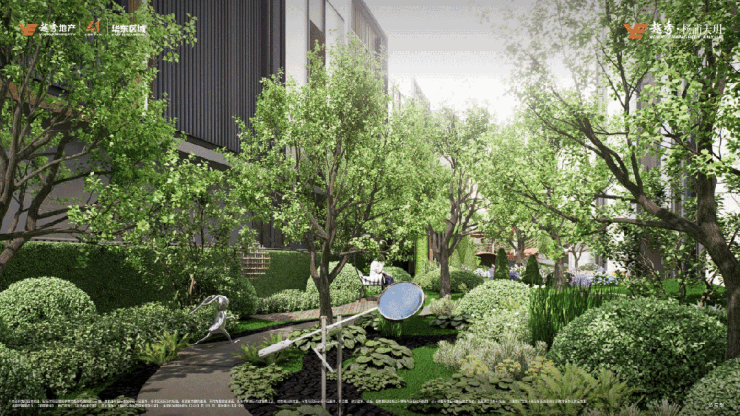 社区内部,越秀打造了由黑松、榉树、朴树、娜塔莉、红枫..等名贵树种组成的五境游园.