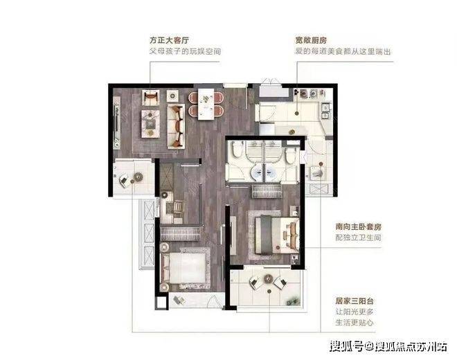 南向三阳台规划,均为非关闭阳台,其间两个阳台为灵动空间,可以精确的经过家庭需求规划丰厚的日子场景空间。