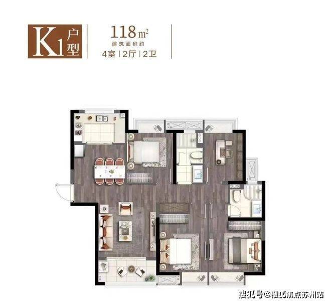 该户型为“四房两卫”格式,空间规范开阔、大面宽窄进深、装备阳台和全卧飘窗,合适咱们庭质量改进。